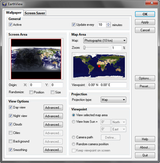 EarthView - это динамические обои и скринсейвер в виде карты нашей планеты или глобуса вращающегося синхронно с оборотом земли (поддерживает смену дня/ночи, облака, огни городов). EarthView может работать как скринсейвер, который создает высокодетализированные красивые виды земли (глобус или карта). Программу выделяют очень высокое качество изображения и насыщенные цвета. Все параметры генерации изображения гибко настраиваются, что позволяет подстроить качество изображения под производительность конкретного компьютера. С сайта разработчика можно скачать дополнительные (фотореалистичные) карты земной поверхности.