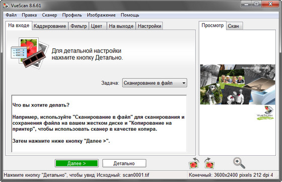 VueScan Pro - программа для работы со сканерами HP, Minolta, Nikon, Polaroid, Epson, Canon и другими. Может работать с внутренней глубиной цвета. VueScan поддерживает автоматическую и ручную настройку большинства параметров и пакетный режим сканирования. Поддерживается более 500 моделей сканеров с определенным перевесом в сторону слайд-сканеров — Nikon, Minolta, Polaroid, Microtek, Epson. Предусмотрено автоматическое удаление дефектов изображения за счет канала инфракрасного сканирования и многопроходное сканирование с последующим усреднением результата — для подавления собственных шумов сканера. Имеются фильтры подавления зерна, нерезкого маскирования и удаления паразитного оттенка оригинала. Есть средства ручной корректировки динамического диапазона и градационной характеристики (независимо по каналам R, G, B).