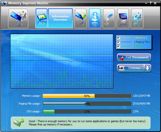 Memory Improve Master - позволяет увеличить быстродействие вашего компьютера за счет освобождения (дефрагментации) оперативной памяти. Имеется возможность установки минимального количества свободной оперативной памяти, при превышении которого запустится модуль и попытается удалить из оперативной памяти лишние процессы. Кроме этого, есть возможность просмотра запущенных процессов, наблюдение за нагрузкой на ЦП и множество других полезных настроек.