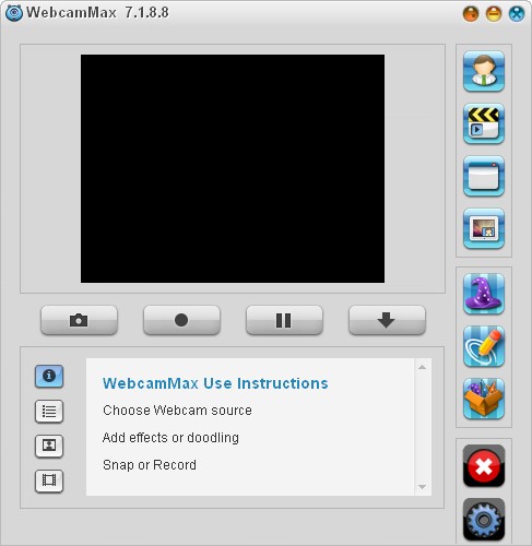 WebCamMax - продвинутая утилита для работы с веб-камерой. Программа, добавляющая изумительные видеоэффекты на все вебкамеры, даже без реальной камеры. Программу можно использовать по умолчанию в таких приложениях, как ICQ, AIM, MSN, Camfrog, Skype, Paltalk, Yahoo, ANYwebcam, Stickam. Можно настроить WebcamMax Full так, чтобы она начинала функционировать и вести трансляцию с камеры только в том случае, когда объектив зафиксирует движение.