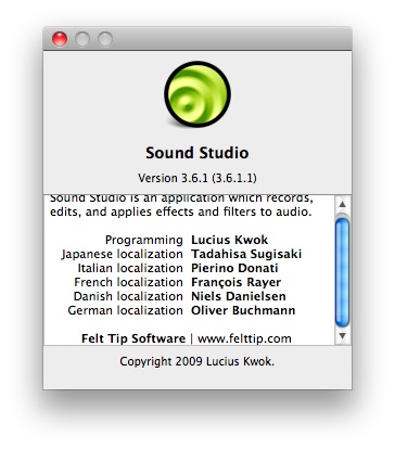 Sound Studio представляет собой простое в использовании Mac OS X приложение для записи и редактирования цифрового звука на компьютере. Оцифровывать кассеты и виниловые пластинки, записи живых выступлений, создавать свои собственные миксы с crossfades, настройки уровней и эквалайзером, применять цифровые эффекты и сохранять во всех основных форматов файлов с Sound Studio 3!
