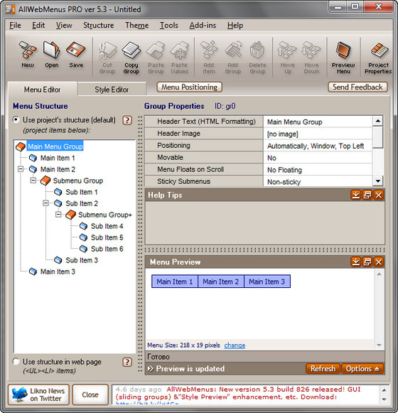 • быстрое создание меню, используя встроенные стили из Галереи AllWebMenus Pro;