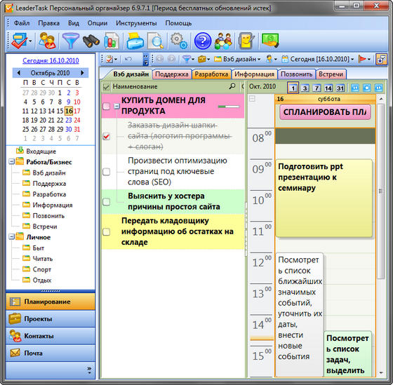 LeaderTask - это умный органайзер для лидеров! Интеллектуальная система управления проектами, событиями, задачами, контактами, освободит вас от рутины и даст больше времени для творчества. LeaderTask поможет вам избавиться от различных поглотителей времени, поможет вам увидеть четкую перспективу жизни, иметь подробный обзор дел, задач, вы будете ставить более высокие цели и достигать их. Кроме того, LeaderTask - это еще и удобный менеджер проектов, с помощью которого можно легко планировать и управлять вашими личными делами, а также бизнес проектами.