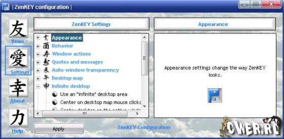 Многофункциональная программа для управления компьютером. Все возможности ZenKEY доступны из всплывающего меню программы, которое вызывается из системного трея, при нажатии определенной комбинации клавиш на клавиатуре или с помощью мыши. ZenKEY позволяет запускать установленные пользователем программы или файлы, изменять свойства окон приложений (включение прозрачности, сворачивание в системный трей и другое), вставлять заготовленные тексты, выполнять системные команды (открытие CD-лотка, выключение компьютера и т.д.) и многое другое. Кроме того, в ZenKEY присутствует возможность управления мультимедиа проигрывателями Windows Media Player и Winamp.