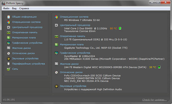 Speccy - это небольшая утилита от разработчиков популярнейшего приложения для очистки компьютера от системного мусора CCleaner. При запуске Speccy мониторит аппаратную часть компьютера, и отображает информацию об операционной системе и характеристики установленного железа. С помощью программы пользователь сможет узнать версию операционной системы, подробную информацию о процессоре, операционной памяти, винчестере, материнской плате, видео карте и др. Кроме того, отображаются температурные показатели процессора и видеокарты, а также рабочая частота RAM и скорость шины процессора.