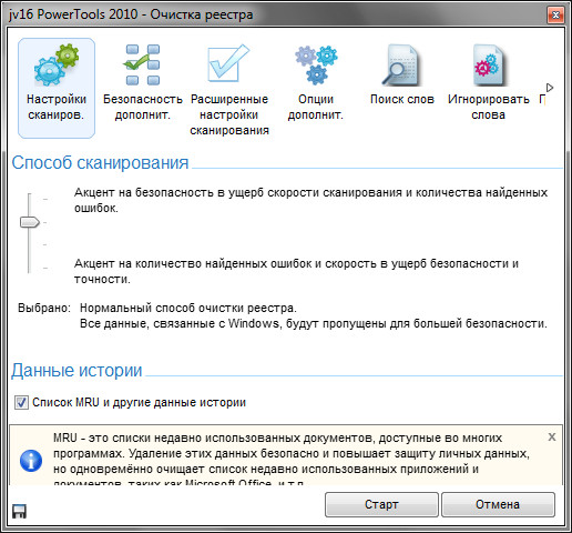 jv16 PowerTools - одна из лучших программ для работы с системным реестром и поддержания в оптимальном состоянии. Включает в себя инструменты для работы с реестром: мощный менеджер реестра - позволяет работать со списком программ из автозагрузки и деинсталляции, со списком зарегистрированных в системе типов файлов, расширений, контекстным меню IE (с тем, в которое часто вставляют свои пункты менеджеры закачек) и некоторыми другими. Этот менеджер часто помогает вручную удалить остатки после автоматической очистки реестра программы. Возможно использование в локальной сети.