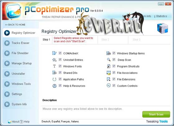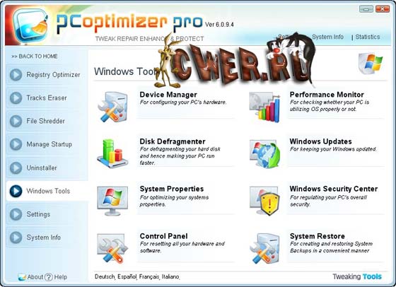 PC Optimizer Pro - программа для очистки, восстановления и оптимизации операционной системы Windows в несколько кликов мышью. Программа позволяет оптимизировать производительность вашего компьютера, заставляя ваш компьютер работать быстрее, и позволяет исправлять различные ошибки системы, предотвращая до 90% всех сбоев в работе компьютера. Программа состоит из набора системных утилит, которые помогут вам очистить системный реестр и жесткий диск от мусора, удалить ненужные приложения и программы из автозапуска, покажет вам информацию о вашей системе, а также сделает резервную копию на случай сбоя в системе и множество других операций.