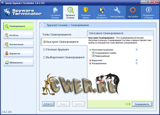 - Быстрое и полное сканирование. Spyware Terminator проверяет все важны части системы компьютера (процессы, библиотеки, панели инструментов, регистр, меню старт...). Возможность выбора области сканирования.