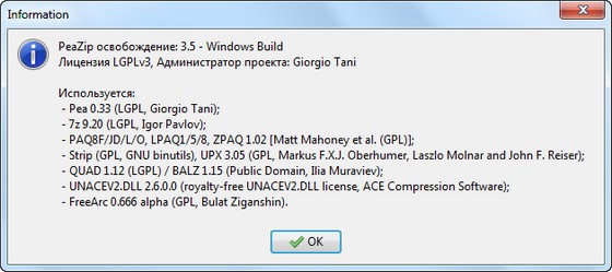 - Создаёт архивы в форматах: 7Z, 7Z-sfx, ARC/WRC, BZ2/TBZ2, custom, GZ/TGZ, PAQ/LPAQ, PEA, QUAD/BALZ, split, TAR, UPX, ZIP.