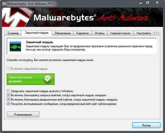 Malwarebytes' Anti-Malware - новая версия программы от создателей RogueRemover Pro, AboutBuster и других популярных утилит, способная находить и удалять разнообразные вредоносные программы. Программой используется эвристический метод сканирования, позволяющий в реальном времени контролировать безопасность всей системы. Также имеется возможность полного сканирования всех дисков. Помимо этого, в состав данной программы входят дополнительные утилиты, предназначенные для удаления вредоносных программ вручную. Обладает понятным пользовательским интерфейсом с многоязычной поддержкой, включая поддержку русского языка.