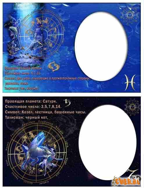 Фоторамки всех знаков зодиака. Если поместить в предназначенное окно портрет любимого, дорогого вашему сердцу человека, то получится оригинальная поздравительная открытка ко дню рождения.