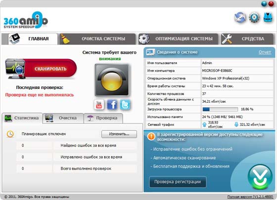 360Amigo System Speedup - инструмент, который поможет вам оптимизировать работу компьютера и исправить ошибки в его работе. В программу 360Amigo System Speedup входят инструменты для очистки системы, оптимизации системы и целый набор инструментов, созданных специально для улучшения работы компьютера.