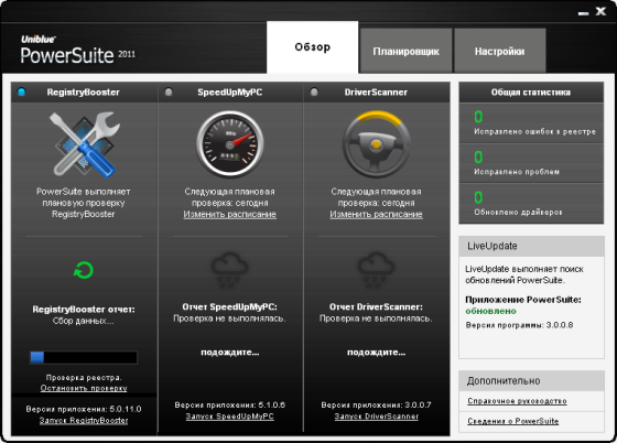 Uniblue PowerSuite 2011 - является полным решением для повышения производительности компьютера. Слияние RegistryBooster, DriverScanner и SpeedUpMyPC в рамках единого интерфейса, PowerSuite повышает и защиту уязвимых групп, но очень важных элементов системы привязаны к скорости и стабильности.
