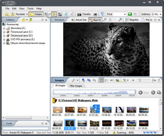 ExifPro - приложение, предназначенное для отображения, обработки и просмотра фотографий. Программа позволяет отображать изображения в нескольких режимах. Выделенные изображения вы сможете копировать, изменять в размерах, обрезать и всячески настраивать, используя инструменты, встроенные в программу. Также данная программа позволяет отображать EXIF информацию, встроенную в фотографии, описывающей различные параметры фотокамеры, которая была использована во время снимка. С помощью программы можно создавать HTML альбомы, слайд-шоу, с использованием встроенных в программу генераторов, печатать изображения, добавлять описания и теги к изображениям. Отдельное окно просмотрщика предлагает пользователю инструменты для масштабирования и панорамирования, коррекции цвета и вида изображений, инструмент лупы и режим слайд-шоу.