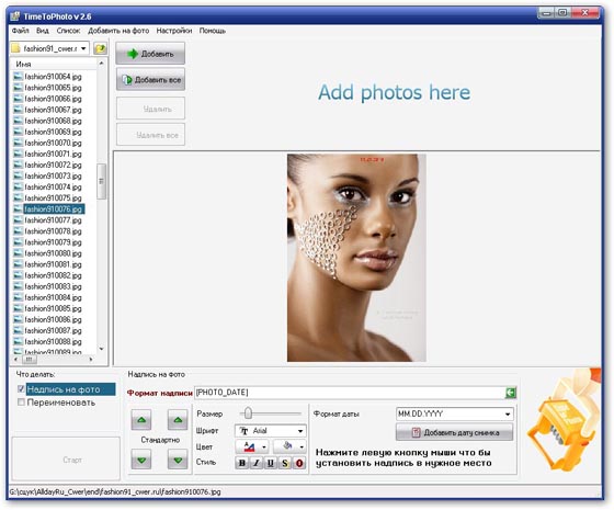 TimeToPhoto работает полностью автоматически т.к. берет дату и время фотографии из каждого конкретного JPG файла. Вы можете добавить даты сразу на все фотографии, определите только один раз параметры надписи: шрифт, место на фотографии, размер, цвет.