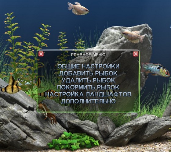 - Аквариум можно использовать в качестве заставки на рабочем столе (в перечень заставок в свойствах экрана добавляется автоматически) или запускать принудительно как обычную программу.