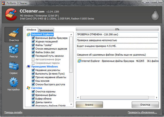 CCleaner также очищает временные файлы и списки недавно открытых файлов других программ, например: Media Player, Safari, eMule, Kazaa, Google Toolbar, Netscape, MS Office, Nero, Adobe Acrobat, WinRAR, WinAce, WinZip и другие...