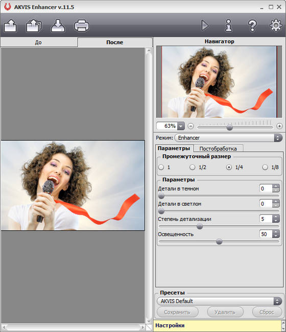 Режим Enhancer обеспечивает комплексную коррекцию каждой точки изображения без потери качества, позволяет исправить любую отдельную фотографию, проявить детали в светлых и темных областях. В этом режиме программа улучшает текстуры, подчеркивает детали, "вытаскивая" их из засвеченных и затемненных областей. Enhancer исправляет недодержанные фотографии, снимки, сделанные против солнца, и даже помогает избавиться от тумана или дымки.