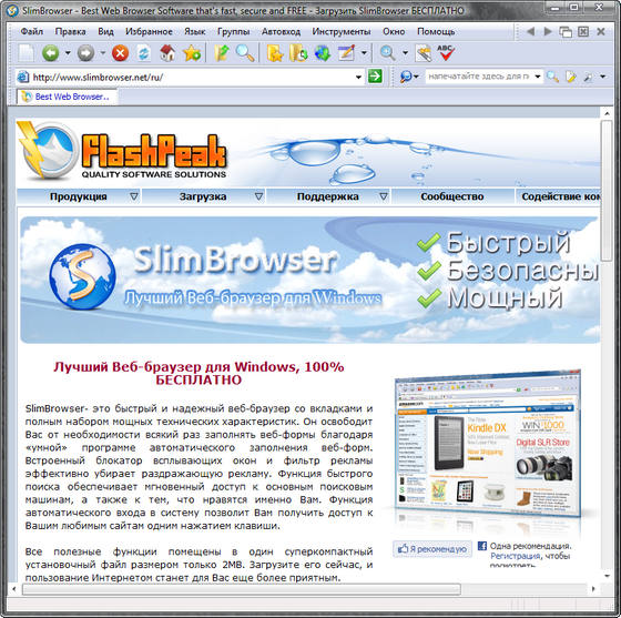 SlimBrowser - браузер, построенный на движке Internet Explorer, но с показом всех веб-страниц в одном многовкладочном окне, расширенной системой поиска, переводом веб-страниц и другого текста, системой автозаполнения разнообразных веб-форм, открытием и сохранением группы страниц одним кликом, автозакрытием всплывающих окон, поддержкой чтения RSS-лент и т.д. Поддерживается подключение дополнительных панелей управления, задаваемых через XML. Имеются опции контроля за загружаемым контентом - откл/вкл загрузки графики, анимации, звуков; интерфейс - многоязычный (нужный язык докачивается прямо из программы).