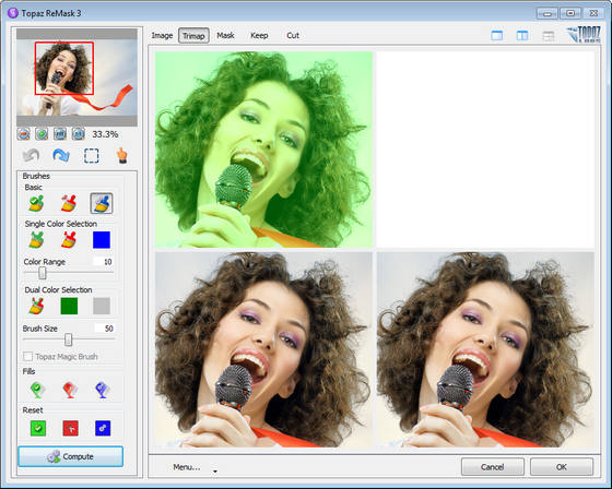 Передовые технологии Topaz ReMask работает с помощью "Tri-map", то-есть пользователю представляется возможность выбора из сгенерированных карт-масок, состоящих из трех тонов: белого, черного и серого. Пользователи имеют возможность быстро определить элементы изображения, которые они хотят использовать: белый — элементы, которые надо сохранить, черный область картинки от которой хотят избавиться, серый — команда для ReMask для вычислений.