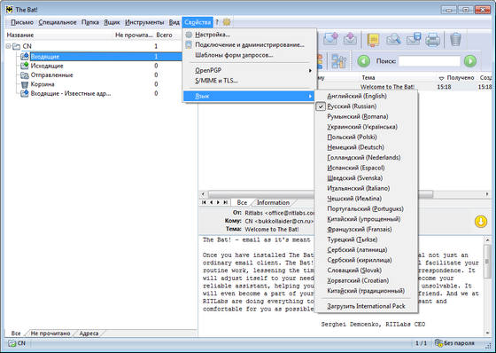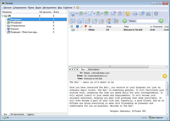 The Bat! – общепризнанная система обработки электронных сообщений, которая прекрасно совмещает в себе все качества, необходимые опытному пользователю. Интуитивный интерфейс позволяет пользователям The Bat! приступить к работе сразу после установки. Эффективный механизм фильтрации и сортировки помогает обрабатывать огромные потоки входящей почты, с которыми не справляются другие программы. Системные администраторы по достоинству оценят возможность установки в пакетном режиме, которая позволяет лично контролировать процесс инсталляции The Bat!. Все эти функции, наряду с полностью настраиваемыми инструментами автоматической обработки, избавляют пользователей от рутинной работы.