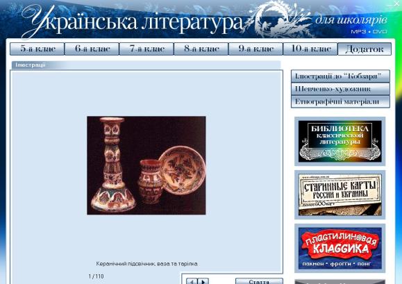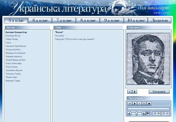 Сборник охватывает произведения, предусмотренные новой Программой по курсу украинской литературы для 5-10 классов общеобразовательной школы: рассказы, новеллы, романы и стихи лучших украинских авторов; образцы устного народного творчества. Диск содержит почти девяносто часов звукозаписи в формате МРЗ. Произведения, начитанные профессиональными актерами, подаются без сокращений. В качестве приложения в сборник включены биографии и портреты авторов, этнографические материалы, а также иллюстрации к "Кобзарю", выполненные Василием Седляр. В последнем разделе находится коллекция графических произведений Т.Г. Шевченко (сто тридцать пять рисунков). Интуитивно понятный интерфейс значительно упрощает работу с диском и делает ее максимально удобной для пользователя. Издание будет полезно учащимся и преподавателям школ.