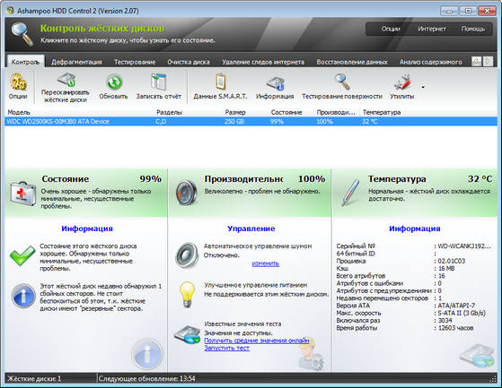 Ashampoo HDD Control - программное обеспечение для контроля за состоянием жестких дисков. Выполняет обслуживание жесткого диска для Вас. Позволяет предотвратить потенциальные отказы и аварии прежде, чем они произойдут. Программное обеспечение поддерживает жёсткие диски типа IDE и последовательные ATA. Ashampoo HDD Control предоставляет пользователю все важные факты и информацию о дисководе, включая регистрационный номер, версию БИОСА (прошивки), размер кэша, количество разделов, на которые разбит хард, свободном месте на диске и текущей температуре.