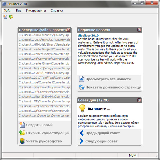 Sisulizer - данная программа предназначена для локализации разнообразного программного обеспечения. Процесс локализации происходит путём сканирования приложения и определения всех участков текста. Поддерживает работу непосредственно в C++ Builder, Delphi, Visual C++, Visual Basic, jаvа, XLIFF. Позволяет визуально работать с HTML и XML, а также отбирать текст из текстовых файлов и баз данных. Программой осуществляется поддержка мобильных приложений: .NET для смарт-устройств, Pocket PC, Windows mobile, Symbian, и J2ME. После сканирования происходит перевод текста с использованием визуального редактора и последующее сохранение проекта с локализацией. После установки программы вы сможете сразу же начать переводить ваши любимые, но не локализованные программы - от вас только требуется знание языков. В данной программе имеется функция автоперевода текста, однако данная возможность будет удобна только при переводе небольших словосочетаний. Программа имеет интуитивно-понятный и многоязычный интерфейс, с поддержкой большого количества языков, включая русский.