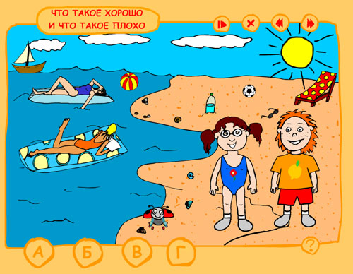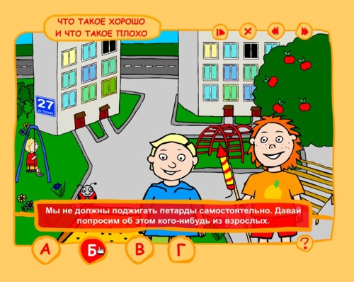 Стоит ли прятаться под деревом, если во время прогулки на улице началась гроза с молнией? Лезть ли самому спасать любимого котенка, если тот забрался на высокое дерево? Что ответить незнакомым людям, если они подходят на улице и предлагают пойти с ними? Ответить на эти вопросы поможет игра "Что такое хорошо и что такое плохо". С помощью этого познавательного диска ребенок научится распознавать опасные ситуации и разумно на них реагировать. Просматривая забавные анимационные ролики, малыш будет выбирать ответы из предложенных вариантов. При этом он не только весело проведет время, но и сможет в дальнейшем правильно действовать в нестандартных обстоятельствах. Игра рассчитана на детей в возрасте от 4 лет.