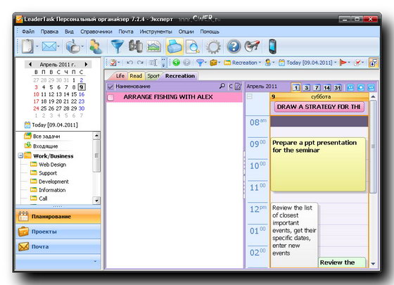 LeaderTask - это умный органайзер для лидеров! Интеллектуальная система управления проектами, событиями, задачами, контактами, освободит вас от рутины и даст больше времени для творчества. LeaderTask поможет вам избавиться от различных поглотителей времени, поможет вам увидеть четкую перспективу жизни, иметь подробный обзор дел, задач, вы будете ставить более высокие цели и достигать их. Кроме того, LeaderTask - это еще и удобный менеджер проектов, с помощью которого можно легко планировать и управлять вашими личными делами, а также бизнес проектами.