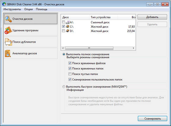SBMAV Disk Cleaner - мощная утилита для очистки дисков от различного информационного мусора, который не содержит никакой важной информации, загромождает диски, загружает систему и снижает производительность всего компьютера. С ее помощью можно производить поиск и удаление временных файлов и папок не только системы, но и иных программ, производить поиск неверных ярлыков, деинсталлировать программное обеспечение, отключать или удалять неиспользуемые шрифты, удалять ненужные Cookies, производить поиск дубликатов файлов. Также с ее помощью можно работать с пользовательскими файлами: выявлять и удалять устаревшие резервные копии и документы, производить поиск дубликатов файлов по различным параметрам, выявлять и удалять ненужные. Программа имеет дружественный интерфейс и проста в использовании.