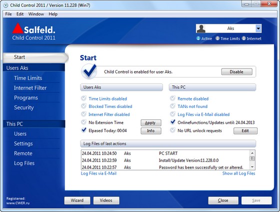 Salfeld Child Control - программа ограничивает время, проводимое вашими детьми за компьютером, как только выделенное им время закончится, компьютер автоматически выключится и повторный вход будет возможен только после ввода пароля. Ограничение можно ввести как по общему времени (например, не более 1 часа в день), так и по периоду времени, когда можно работать (например, с 22:00 до 8:00 доступ запрещен). Кроме этого, программа позволяет запретить посещение нежелательных сайтов, а также заблокировать доступ к определенным дискам и папкам.