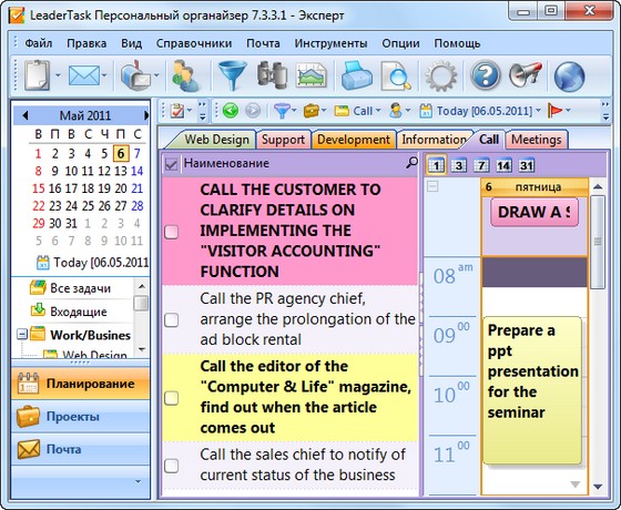 LeaderTask - это умный органайзер для лидеров! Интеллектуальная система управления проектами, событиями, задачами, контактами, освободит вас от рутины и даст больше времени для творчества. LeaderTask поможет вам избавиться от различных поглотителей времени, поможет вам увидеть четкую перспективу жизни, иметь подробный обзор дел, задач, вы будете ставить более высокие цели и достигать их. Кроме того, LeaderTask - это еще и удобный менеджер проектов, с помощью которого можно легко планировать и управлять вашими личными делами, а также бизнес проектами.