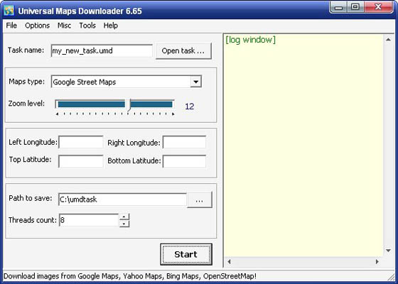 Universal Maps Downloader - это программа для загрузки частей спутниковых снимков-карт поверхности Земли c серверов Google, Yahoo или Microsoft для их дальнейшего просмотра встроенным обозревателем Maps Viewer и сборки в единое целое с помощью инструмента Maps Combiner. Для начала загрузки Вам необходимо указать папку для сохранения файлов, масштаб будущей карты, сервер, с которого будет произведена загрузка и географические координаты (широта, долгота) участка земной поверхности.