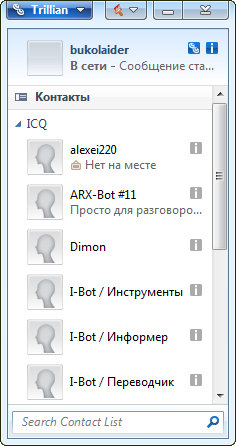 Trillian - универсальный клиент для передачи сообщений через серверы ICQ, AIM, IRC, Yahoo и MSN Messenger. После его установки можно будет обмениваться сообщениями сразу во всех перечисленных сетях без установки самих программ ICQ, AIM и т.д. Доступны такие возможности, как зашифрованный чат (как двухсторонний, так и в режиме конференции), поддержка множественных ICQ/AIM одновременных сессий, мультисерверные соединения, звуковые эффекты, поддержка скинов (через XLM) c возможностью подстройки (вроде прозрачного фона).