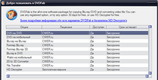 DVDFab – мощный, многофункциональный программный продукт для копирования DVD дисков с возможностями гибкой обработки видеопотока. Программа является одной из лучших на сегодняшний день, из инструментов для копирования, разбиения, пережатия и конвертирования DVD дисков с фильмами. Снимает все защиты и ограничения с диска и при желании пережмет диск большой емкости и вместит его в обыкновенную пустую DVD болванку с минимальными потерями качества (DVD9->DVD5) или разобьет фильм на два диска с полным переносом его меню, удалит всю рекламу, запишет только фильм и многое другое. Программа имеет интуитивно понятный, мультиязычный интерфейс включая русский.