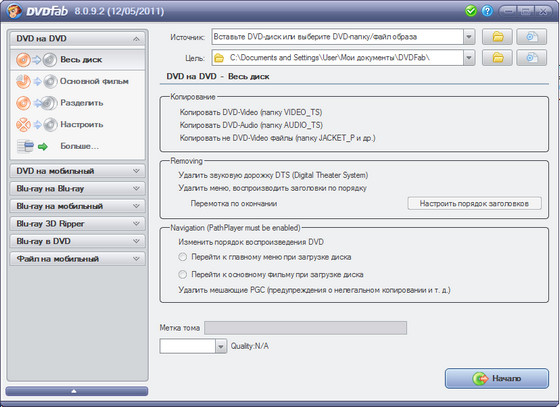 - Копировать на чистый DVD диск любого формата(DVD+R/RW, DVD-R/RW, DVD+R DL, DVD-R DL).