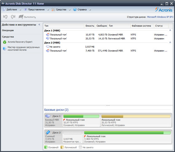 В Acronis Disk Director предусмотрено множество функций, включая следующие: