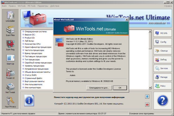 WinTools.net Ultimate – набор инструментов для оптимизации операционной системы Windows. В состав программы входят компоненты для полного удаления нежелательных программ и «мертвых» ссылок реестра, а также для контролирования процессов, настройки системы, интернет-соединений и интерфейса. В состав программы входят следующие инструменты: Clean Uninstaller, Scan Files, Scan Shortcuts, Scan Registry, Startup Manager, Tweak UI, Net Tweaker, The Privacy, Invisible Man, File Shredder. Кроме того, имеются утилиты для надежного хранения конфиденциальной информации.