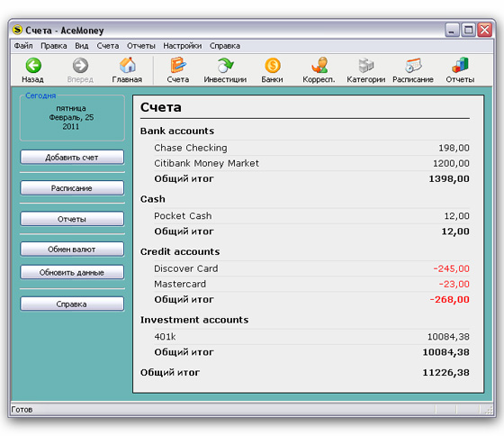 Наличка, сберегательные счета, кредитные карты, долги, кредиты. Пользователь может сам задать новые типы счетов. Например, многие родители создают счета типа Карманные расходы для детей и приучают их контролировать свои расходы с помощью AceMoney.