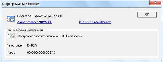 Product Key Explorer - позволяет расшифровать и увидеть, а также сохранить серийные номера (Product ID, Product Key, License Info, User Name, Company) продуктов Microsoft, CD-key установленных на компьютере программ, и не только их. Неполный список ПО, регистрационные данные которых можно увидеть и сохранить: Micrsoft Windows (2000, XP, 2003, Vista), Microsoft Office 2003, Microsoft Office 2007, Microsoft Office XP, Micrsoft Visual Studio 2005, Macromedia, Ahead Nero, Adobe Photoshop, CyberLink PowerDVD, Borland Delphi и т.д.