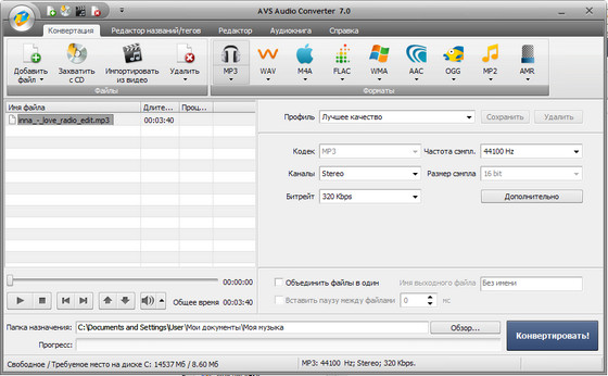 AVS Audio Converter - программа для преобразования аудио файлов из одного формата в другой. Поддерживает конвертирование WAV, OGG Vorbis, MP3, MP2, Microsoft ADPCM, WMA, VOX, AAC, M4A, AMR и других аудио форматов. До процесса преобразования программа определяет частоту, число каналов и другие параметры аудио файлов. Кроме этого, AVS Audio Converter позволяет задавать настройки параметров для MP3 и форматов OGG при преобразовании аудио-файлов и изменять информацию в тэгах. Дружественный и удобный интерфейс, расширенная поддержка форматов, которые предлагает AVS Audio Converter, превратят в удовольствие рутинную операцию конвертации аудио.