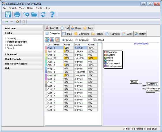 Xinorbis поможет узнать о содержимом вашего жесткого диска практически все, начиная от того, какие документы и директории занимают больше всего места, и заканчивая тем, файлов какого типа больше — системных, музыкальных или, например, графических.
