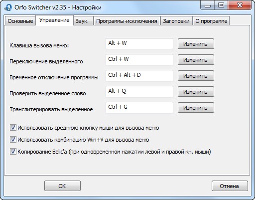 В меню Настройки можно установить опции действий по автоматической смене клавиатуры. Для Windows XP конвертация набора текста происходит автоматически – программа проверки орфографии распознает сочетания литер в соответствии с грамматикой русского или английского языков. В Windows Vista текст, набранный английскими литерами, конвертируется через выделение фрагмента текста и нажатия Ctrl+Q.