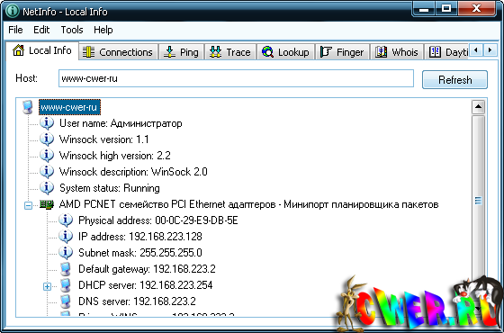 Netinfo - комплект программ, предназначенный для получения данных о состоянии локальной сети и отдельном персональном компьютере в сети. Netinfo выдаст подробный отчет, в котором отображены процессы, создающие сетевые подключения, и серверы, к которым они производят подключение. Также утилита выполнит пинг или трассировку до любого хоста и выдаст информацию о владельце того или иного сайта при помощи whois.