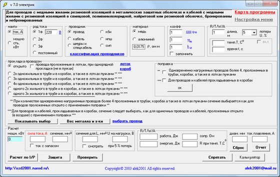 - выбрать сечение провода, кабеля, шнура и спецкабеля при определенной прокладке и потерю напряжения для проводников до 1000 В при определенной длине;