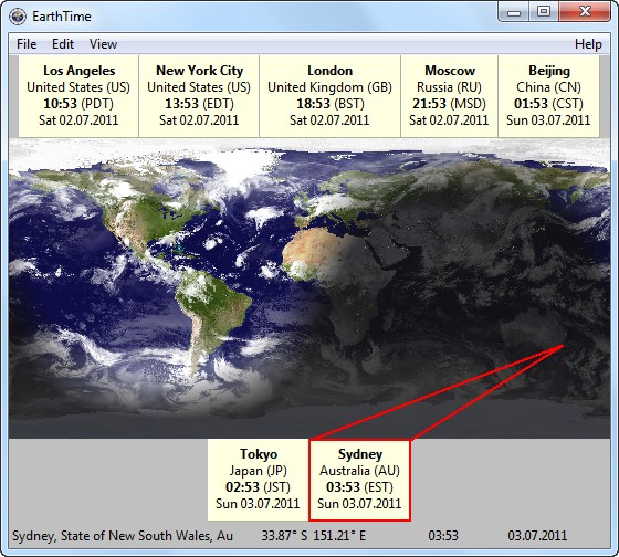 EarthTime - программа для показа локального времени и даты любого места земного шара. Программа имеет встроенную базу данных более 3000 городов Земли, а также позволяет пользователю добавлять любое количество собственных локаций. Позволяет устанавливать будильники на любое локальное время любого города нашей планеты. Множество опций в данной программе предоставляют пользователю гибкие настройки часовых поясов и локального времени.