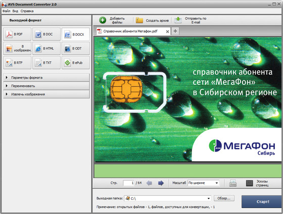 AVS Document Converter - предназначена для просмотра и конвертации разных типов документов. Она читает текстовые и графические файлы и конвертирует их в PDF, DOC, DOCX, RTF, TXT, ODT, HTML, JPEG, TIFF, EPUB и другие форматы.