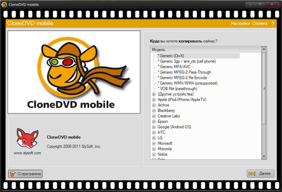 CloneDVD mobile — программа для конвертации DVD фильмов в форматы мобильных устройств. С помощью CloneDVD mobile вы сможете преобразовать DVD видео для просмотра на портативных устройствах, таких как Sony PSP, Apple iPod Video, iAudio X5, Creative Labs ZEN Vision, мобильных телефонов и многих других устройств. Также вы сможете конвертировать DVD фильмы в другие форматы, такие как DivX, XviD, AVI, MP4 и т.д. Таким образом, благодаря CloneDVD mobile вы сможете смотреть ваши любимые DVD фильмы или ТВ передачи в любое время и в любом месте на одном из ваших портативных устройств. Например, вы можете так конвертировать любимые мультфильмы ваших детей для просмотра на мобильном устройстве и они смогут смотреть свои мультики прямо в машине. Копирование DVD фильмов в мобильные форматы происходит всего за несколько кликов без необходимости в копировании видео на ваш жесткий диск. CloneDVD mobile обладает многоязычным интерфейсом с поддержкой русского языка.