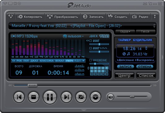 JetAudio — это универсальный проигрыватель музыкальных и видео файлов, риппер, конвертер и т.д., в общем, все в одном комплекте. Программа поддерживает практически все музыкальный форматы, умеет проигрывать MP3, MP2, WAV, MID, REAL AUDIO/VIDEO, S3M, MOD, MPG, AVI, MOV, Video/Audio CD, RealPlayer G2 и некоторые другие форматы мультимедийных файлов. Позволяет записывать аудио компакт-диски или копировать их содержимое на жесткий диск ПК. Есть возможность накладывать на композиции различные эффекты, поддерживается синхронизация для караоке, имеется эквалайзер, конвертер форматов, редактор тэгов, кроссфейдинг, субтитры и т.д.